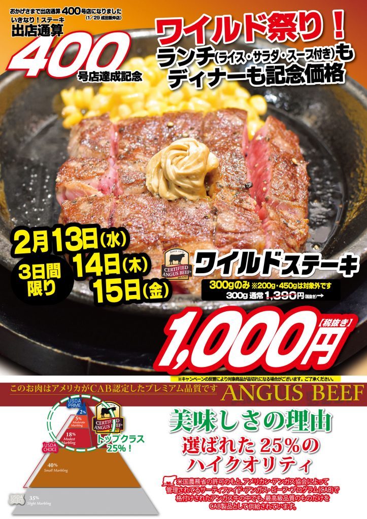 バレンタインデーを明日に控えて、そのいきなり!ステーキの全店でワイルドなワイルド祭りが開催されています!
